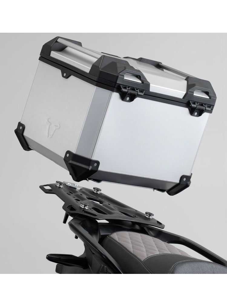 Zestaw: kufer centralny srebrny TRAX ADV + stelaż Adventure-rack SW-Motech Triumph Tiger 900/ GT/ Rally/ Pro (19-) / 1200 GT Explorer / Rally Explorer / Rally Pro (22-),Tiger 850 Sport (21-) [pojemność: 38 L]