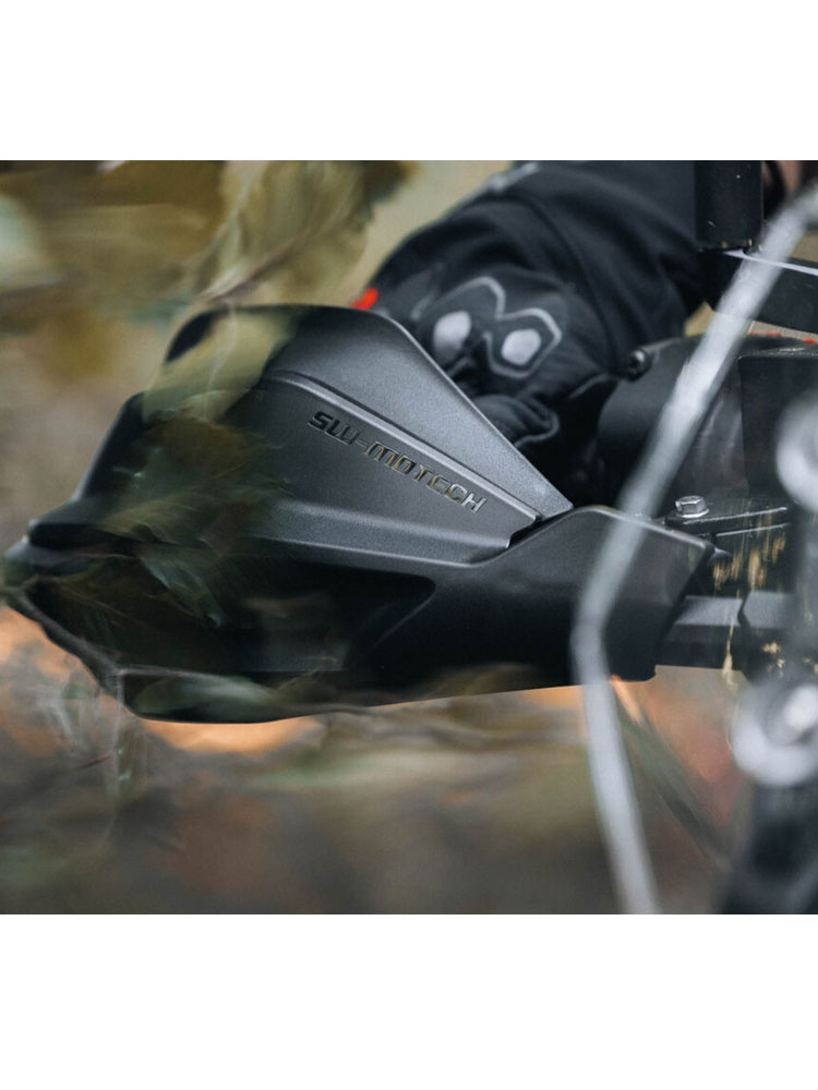 - Osłony dłoni Adventure wykonane z wytrzymałego tworzywa sztucznego, chroniące przed wiatrem, zimnem i deszczem