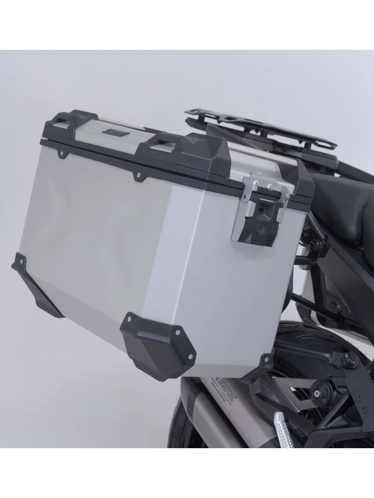 Wytrzymałe aluminiowe kufry TRAX ADV sprawiają, że czujesz się jak w domu na każdym odcinku drogi: wytłoczone wzory zwiększają stabilność spawanego aluminium o grubości 1,5 milimetra. Całkowicie zdejmowana pokrywa z uchwytami wykonanymi z anodyzowanego aluminium oraz zapięcie błyskawiczne ułatwiają załadunek i rozładunek bagażu motocyklowego; fazowana krawędź boczna zapewnia duży prześwit podczas pokonywania zakrętów. Stelaż i wielkość kufrów są idealnie dopasowane do tylnego kształtu i układu wydechowego motocykla. Przy rozwoju TRAX ADVENTURE pojawiło się następujące wyzwanie. Zbudować kufry, które pokonają wszystkie przeszkody motocyklowej codzienności, lekkie i łatwe w obsłudze, po prostu dobre: od praktycznego zamka błyskawicznego, przez zdejmowalną pokrywę, po ergonomiczny uchwyt. TRAX ADVENTURE łączą wysoką jakość z niską wagą. Ważą tylko od 4,6kg do 5,4 kg, czyli należą do grupy najlżejszych kufrów w swojej klasie.